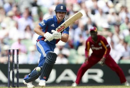 Ian Bell added another fifty in his tally during the 20th over but he was caught in the cover by Chris Gayle off Darren Sammy for 53 off 64 balls with 7 fours. Jonathan Trott came in next as the rate of scoring went down until the 30th over but they picked up in the coming overs. Alastair Cook was the most aggressive of the two and hammered his fifth ODI century on the second ball of the 36th over.