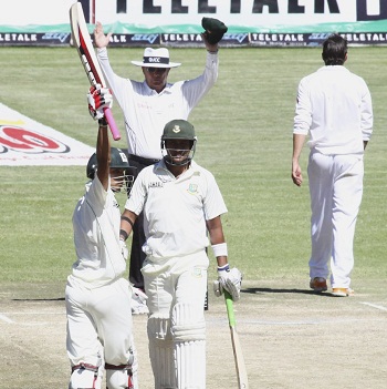Earlier, the visitors went into bat in the morning at 163 runs with five wickets in hand after 49 overs. The Bangladeshi skipper, Mushfiqur Rahim, and Nasir Hossain were unbeaten on 50 and 6 respectively. The beginning was reasonable as the score was taken to 194 after 61 overs and the second hundred of the innings appeared on the screen in the next over with a couple of fours from Mushfiqur Rahim. Nasir Hossain was extremely slow at the other end and scored 17 runs off the first 63 balls he faced and hit his first boundary in the 66th over. The sixth wicket association enhanced the score to 233 when Vusi Sibanda held and acrobatic catch off Mushfiqur Rehman at shortish backward point on the bowling of Hamilton Masakadza for 93 from 153 deliveries with 9 fours.
