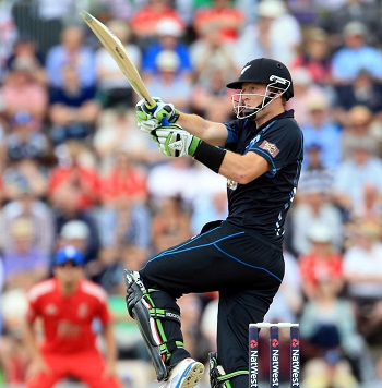 England went into chase with their skipper, Alastair Cook, along with Ian Bell and they scored 22 runs in the first four overs. Bell was dropped at 11 by Guptill off Mitchell McClenaghan in the next over as Cook hit 3 fours in the sixth one. The opening stand came to an end as the bails of Cook were dislodged by Kyle Mills for 34. The first wicket fell at 50 and 14 runs later Bell departed for 25 in 10.3 overs as Jonathan Trott and Joe Root associated in the middle. The duo kept the score board ticking but were unable to get any boundary in the coming six overs. The first hundred of the innings was displayed on board in the 19th over as Trott tasted his first six, two overs later. Root was caught by Doug Bracewell off Nathan McCullum for 28 and was replaced by Eoin Morgan.