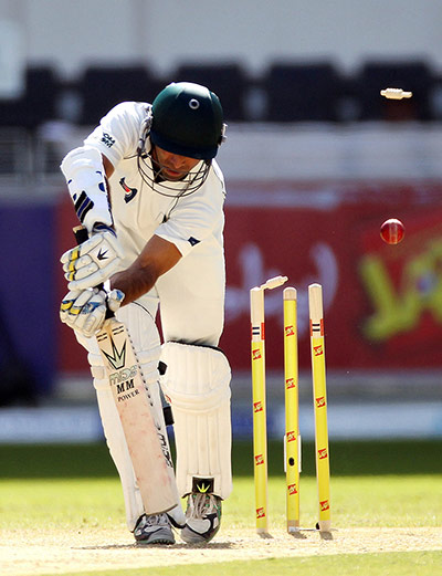 Misbah and Adnan Akmal steadied the innings while negotiating the bowlers according to the merit and securing their wickets. Misbah achieved his fifty on the first ball of the 100th over but was declared lbw four overs later at 52 runs. The newcomer Abdur Rehman could not resist and went back to the pavilion in the very next over at four runs.