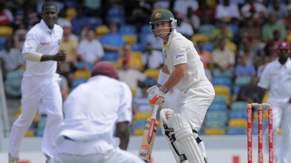 Australia lost the early wicket on the third ball of the 13th over from Sammy when Cowan was caught behind by the wicketkeeper Carlton Baugh for 14 with the addition of six runs in the overnight total. Shane Watson came in next, opened his account with a single and survived a couple of leg before wicket appeals whereas Warner was finding it difficult to score runs freely at the other end. They added 15 runs in the total when Warner was caught in the second slip by Darren Bravo off Sammy for 42 runs.